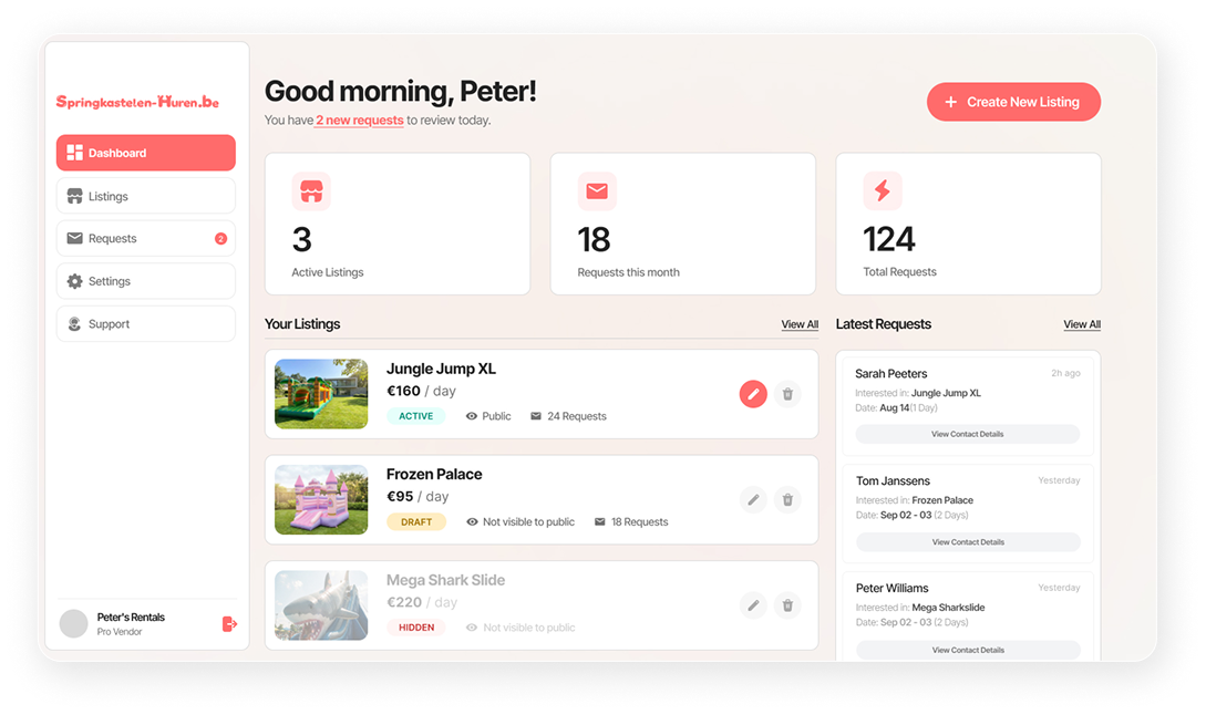 Beheer je springkastelen, prijzen en aanvragen in één overzicht. Handig als extra kanaal, naast je bestaande manier van werken.