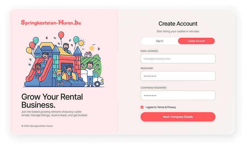 Springkastelen-huren.be is een vergelijkingsplatform waar ouders springkastelen zoeken, en jij, als verhuurder, extra aanvragen ontvangt naast je bestaande werking.